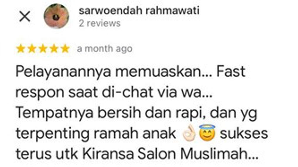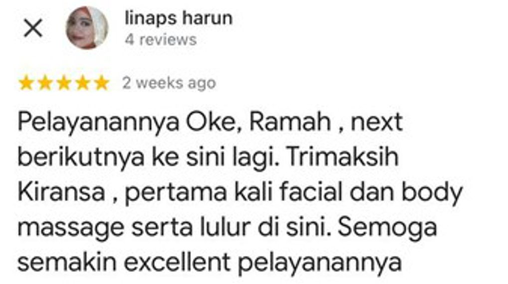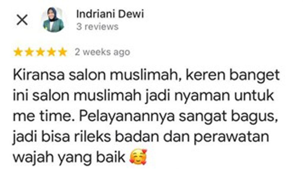 Selamat datang di Kiransa Facial & Salon Muslimah, tempat di mana beauty, privacy, dan happy menjadi prioritas kami. Kami dengan senang hati menghadirkan berbagai perawatan kecantikan terbaik untuk Anda, mulai dari facial, perawatan rambut, hingga perawatan tubuh, semuanya dirancang khusus untuk wanita Muslimah. Kami selalu menjaga privasi dan kenyamanan Anda di setiap langkah. Di Kiransa, kami percaya bahwa kecantikan sesungguhnya muncul dari perasaan bahagia dan tenang. Dengan layanan eksklusif yang menenangkan, kami siap membuat Anda merasa cantik, terlindungi, dan bahagia setiap saat.