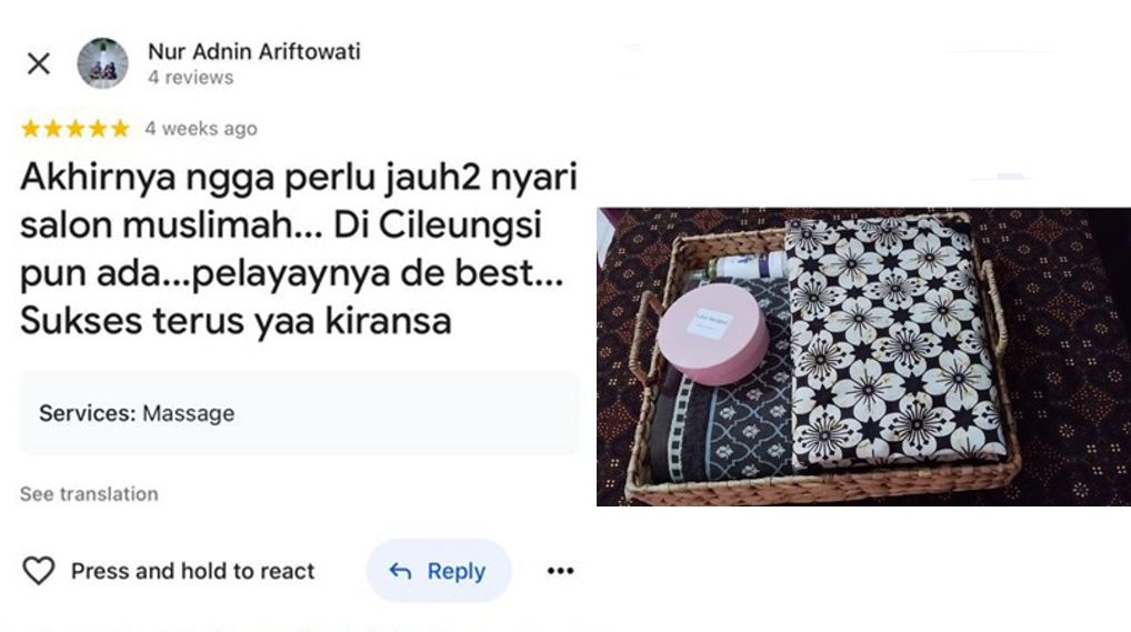 Kami berkomitmen untuk menghadirkan perawatan kecantikan berkualitas menggunakan produk halal dan aman. Kami menjamin privasi dengan ruang tertutup tanpa akses dari laki-laki. Selain itu, di Kiransa seluruh staf adalah wanita muslimah yang ramah dan terlatih sehingga Anda akan merasa nyaman. Kami berharap dapat memberikan kebahagiaan dan kepuasan disetiap kunjungan Anda.